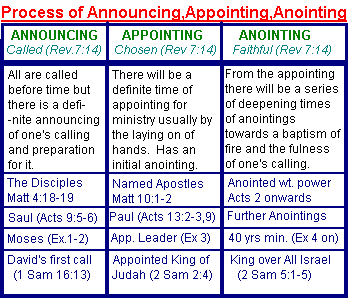 From this diagram we see that the three stages start with an 'Announcing' stage. This relates to the 'called' stage of Revelation 7:14. We are called even before our birth but there will be a definite season of the Lord's 'Announcing' of our call in a recognisable way. For David this was when the Prophet Samual first announced he was to be King of Israel. For the Disciples, this was when Jesus first said 'follow me'. For us there will be a time when the direction of our life will be indicated divinely in a tangible, recognizable way.