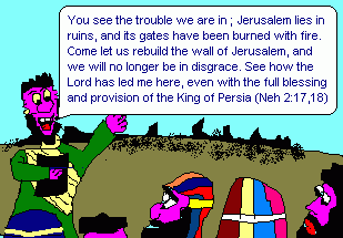 On reaching Jerusalem, Nehemaih found a shanty town among the rubble - a complete disaster - the people were defeated. Once he had a clear estimate of the amount of work to be done, and a plan of action ready, he concentrated on his first goal....