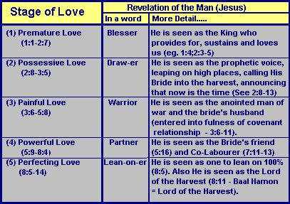 In stage 4 (Powerful Love) both the Bride and Jesus see her as a Warrior - this is not a proud assertion on her part but a humble recognition as she emerges from the ashes of a painful refining in her Character. She also moves from seeing herself as possessing Jesus (He must do what she wants on her terms) to being fully possessed by Him (she is totally dependant on Him).