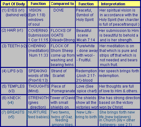 The following chart shows the parts of the body described and can represent different parts of the body of Christ (His Bride) with the different emphases people will have in their ministries. It can also represent different qualities that need to be found in a believer moving into the 'covenant' phase of their relationship with Christ.