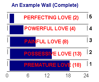 Use your results from the forty questions as you have been directed and you will be able to see your own personal wall that will reveal where you are in terms of your progress of love. Everyone will have their own unique wall, some more stable than others. It is important to read the wall correctly and take the necessary steps to make sure your wall is built properly. It is possible to have a 'false wall' which is not really representative of your love relationship with Jesus (due to not being totally honest in answering the questions). |
